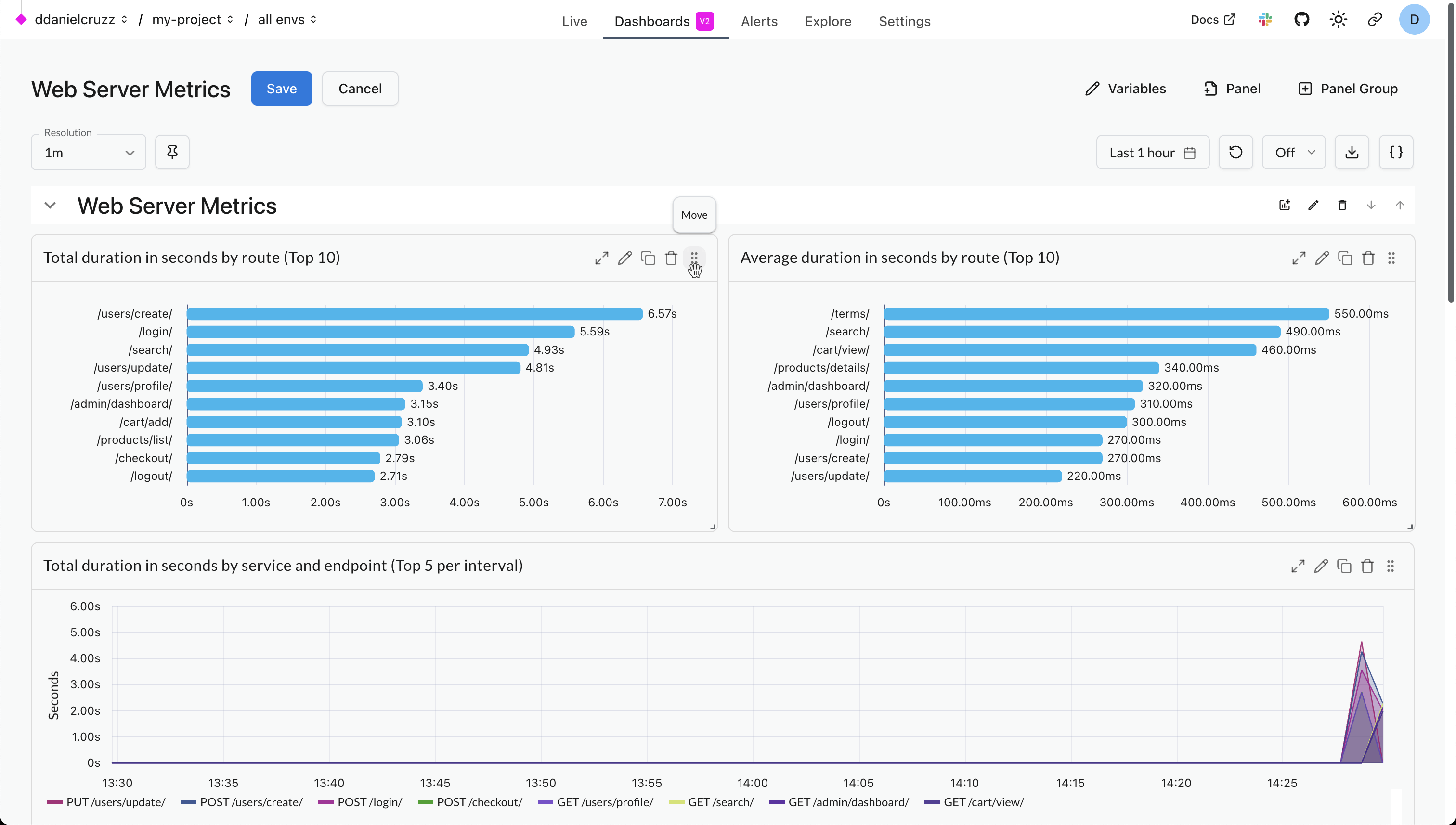 metric which is collected by many instrumentation libraries, including those for FastAPI, Flask, Django, ASGI, and WSGI. The charts give a breakdown by endpoint (and sometimes status code) both overall and over time. Hover over each time series to see the most impactful endpoint at the top of the tooltip. The charts show: