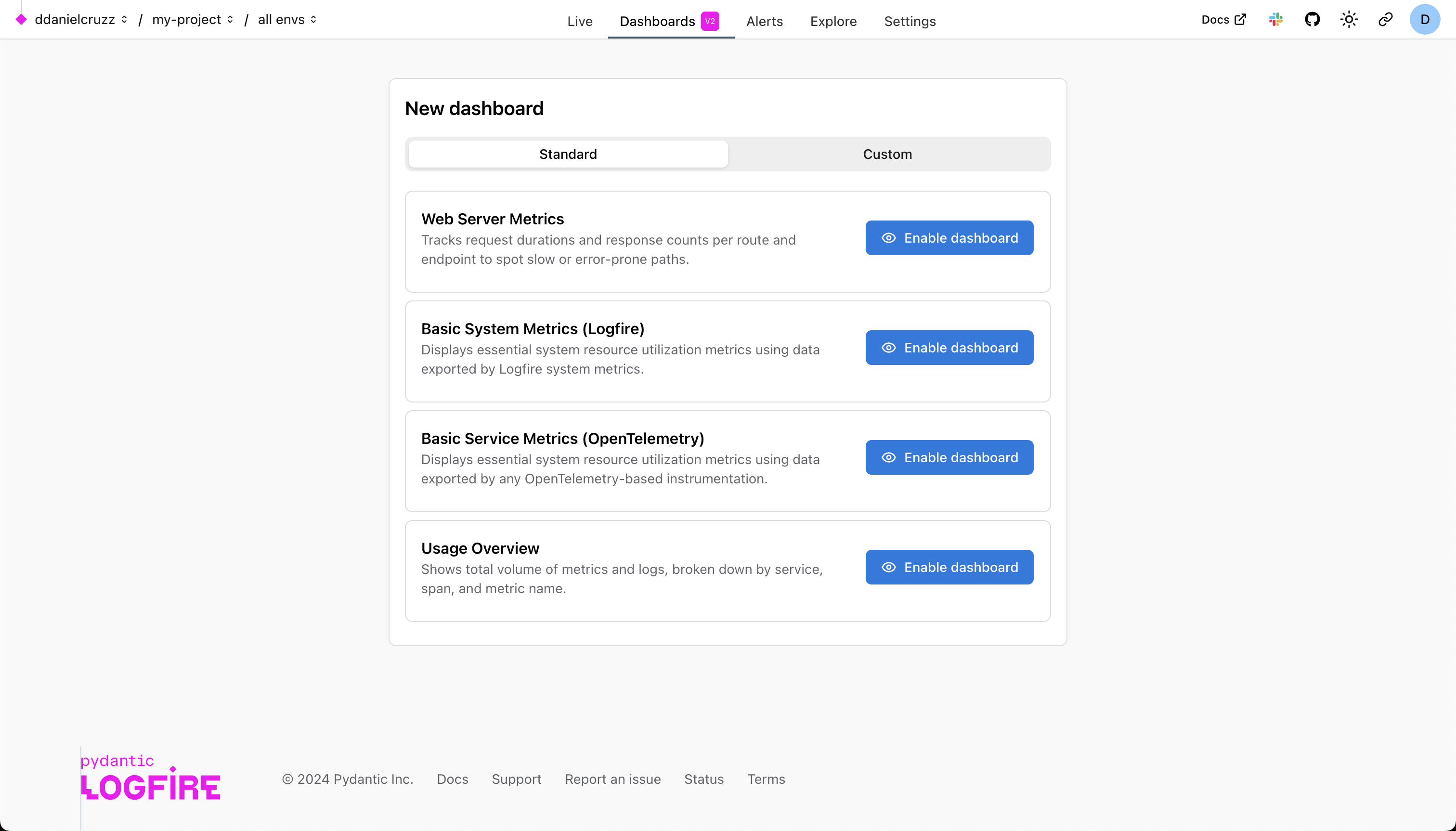 - Standard dashboards: Pre-configured dashboards created and maintained by the Logfire team, providing you with continuous updates and improvements without any effort on your part. You can enable or disable them for your project, but you can't modify them directly.